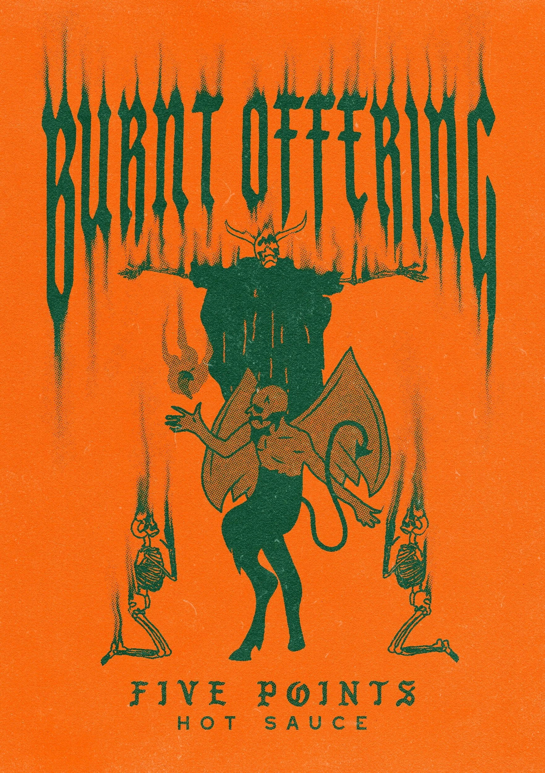 The makers of this brand wanted a dark metal inspired illustration for the release of their new Burnt Offering hot sauce. I was told to go dark with the art style and this is the where we ended up and I couldn’t have had more fun.